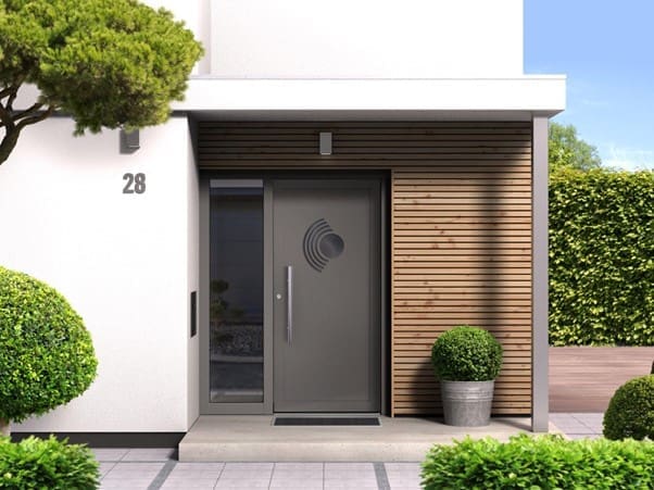 Kolorystyka drzwi w 2026 również ewoluuje – ziemiste odcienie, beż czy głęboka oliwkowa zieleń tworzą subtelne, a zarazem wyraziste połączenia z elewacją. Popularne są także monochromatyczne zestawienia ton w ton z kolorystyką ścian zewnętrznych, dające efekt stonowanej elegancji.