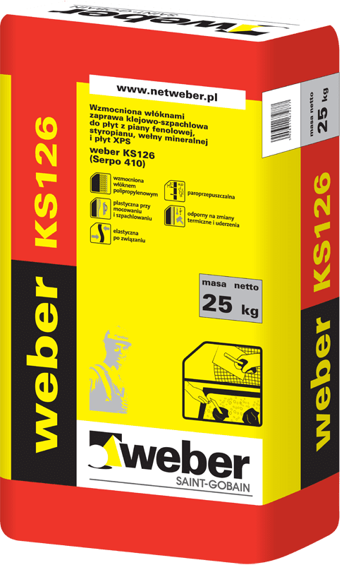 Klej do warstwy zbrojącej WEBER KS 126 znajdzie swoje zastosowanie podczas mocowania wszelkiego rodzaju płyt termoizolacyjnych (włącznie z tworzywami styropianowymi i mineralnymi). Z powodzeniem możemy go również wykorzystać do szpachlowania warstwy zbrojonej siatką. Jeśli chodzi o samą strukturę kleju, zawiera on weń wzmocnienie w postaci włókien polipropylenowych. Po rozrobieniu zaprawa jest w pełni elastyczna zarówno podczas mocowania termoizolacji, jak i w przypadku szpachlowania. Po związaniu klej wyróżnia się wysoką trwałością i wytrzymałością na zmiany termiczne, nacisk czy uderzenia. W porównaniu do konkurencyjnych produktów WEBER KS 126 jest w pełni paroprzepuszczalny i cechuje się podwyższoną przyczepnością do podłoża.