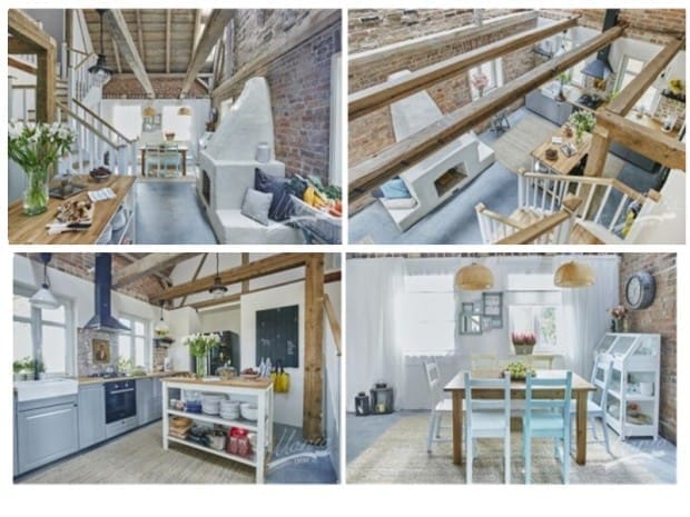 Między kuchnią, a częścią jadalną stoi kominek. Niestety nie oryginalny, ale stylizowany na dawne piece, w których wypiekano chleby. Po obu jego stronach powstało coś na kształt kamiennych siedzisk wyłożonych miękkimi poduszkami. To takie dodatkowe miejsce wypoczynku. Na piętro natomiast prowadzą schody, które łączą cechy stylu skandynawskiego i angielskiego.